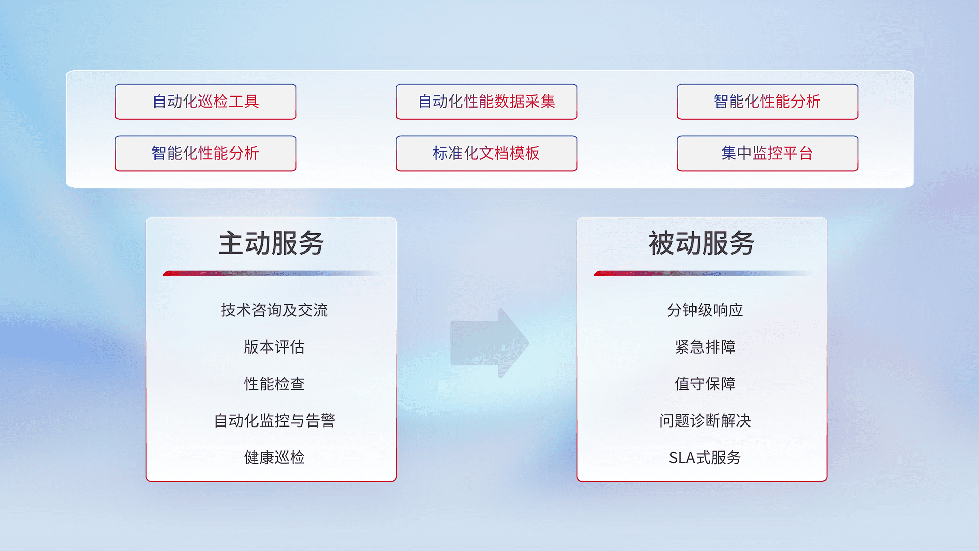 智能化工具和标准化文档,,,保障服务质量,,提供主动服务(包含技术咨询、、、版本评估、、、、性能检查、、、自动化监控与告警、、、健康巡检)和被动服务包含(分钟级响应、、紧急排障、、、、值守保障、、、问题诊断解决、、SLA服务)。。